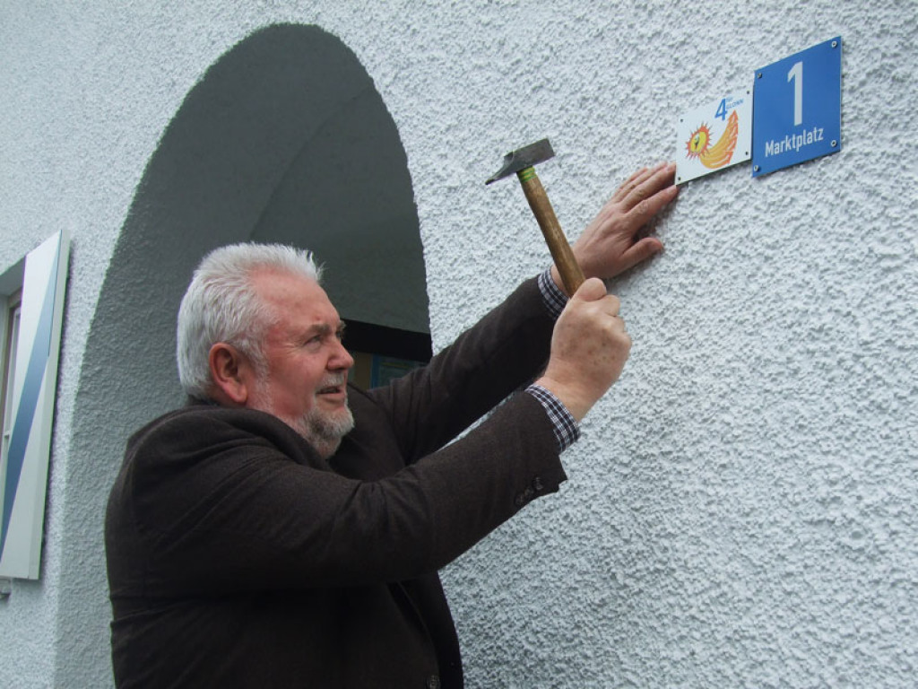 Die Plakette, als Ergänzung zur Hausnummer, ist sehr kostengünstig zu drucken. Sie kann bei Bedarf nachproduziert werden. Die Verteilung erfolgte einmalig bei einer Bürgerversammlung und dann über die Rathauspforte nach Anforderung.