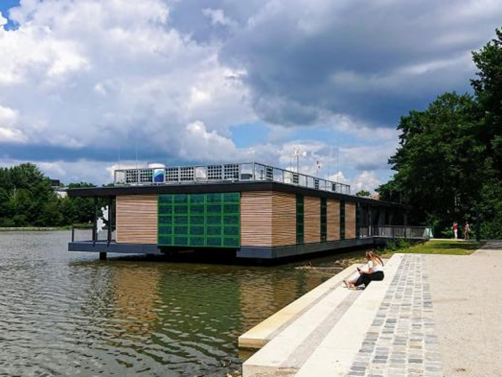 Das Gebäude beinhaltet drei unterschiedliche Funktionen: Die eigentliche Energie-und Umweltstation, ein öffentliches WC und das Bootshaus für das Mähsammelboot des Wasserwirtschaftsamtes