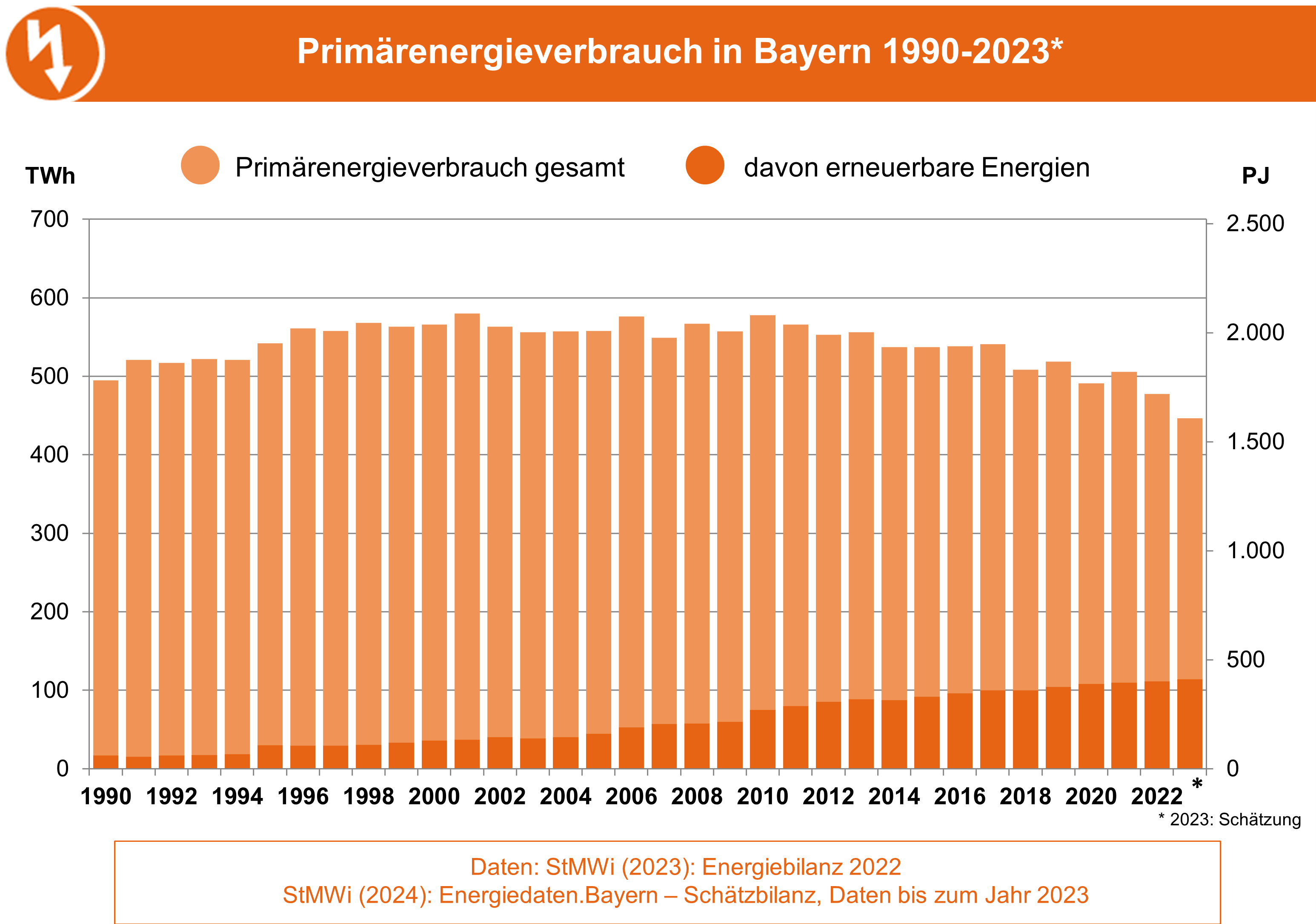 - Ab den 1970er-Jahren hat der Primärenergieverbrauch in Bayern zugenommen.