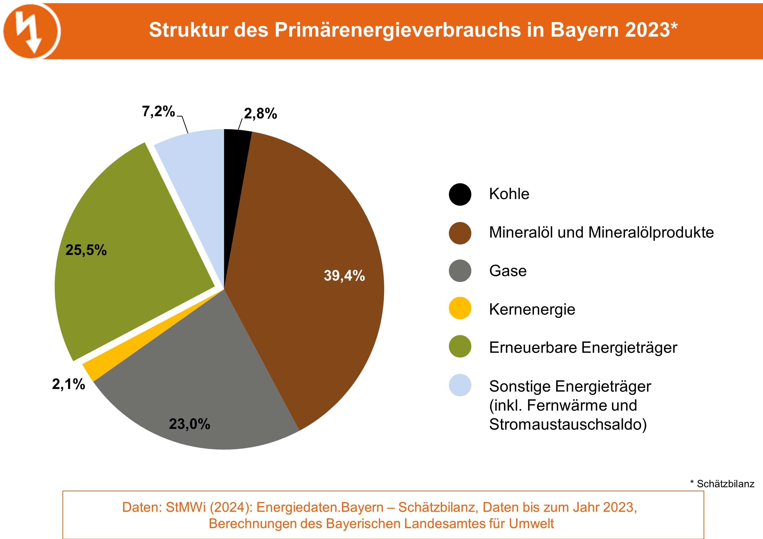 - Der größte Teil des Primärenergieverbrauchs in Bayern entfällt mit 39,4 % auf Mineralöle und Mineralölprodukte, die hauptsächlich in Kraftstoffe umgewandelt werden.