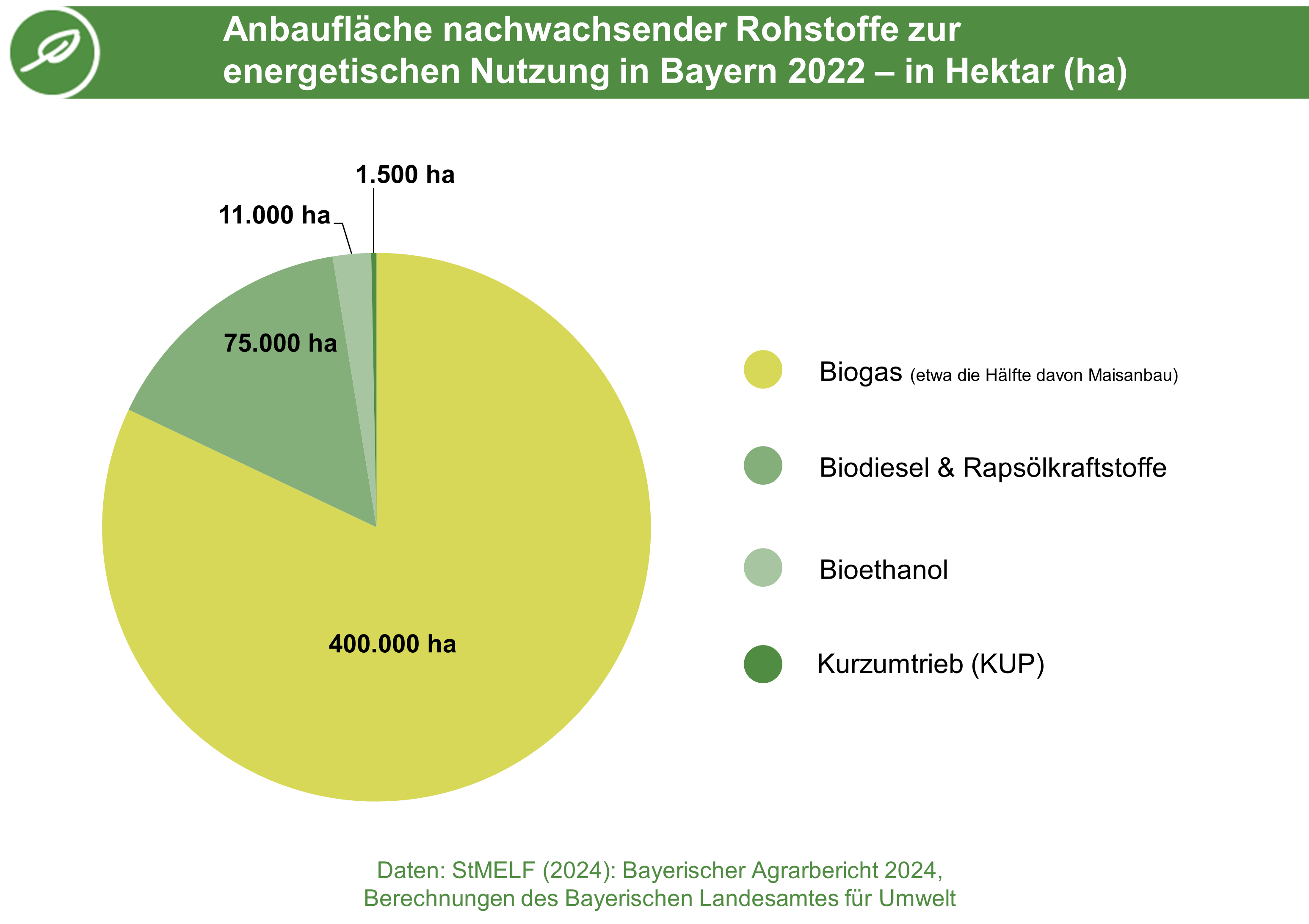 In Bayern wurden 2022 auf etwa 17 % der landwirtschaftlich genutzten Fläche nachwachsende Rohstoffe zur energetischen und stofflichen Nutzung angebaut. Davon entfallen rund 92 % zur energetischen und 8 % auf die stoffliche Nutzung.