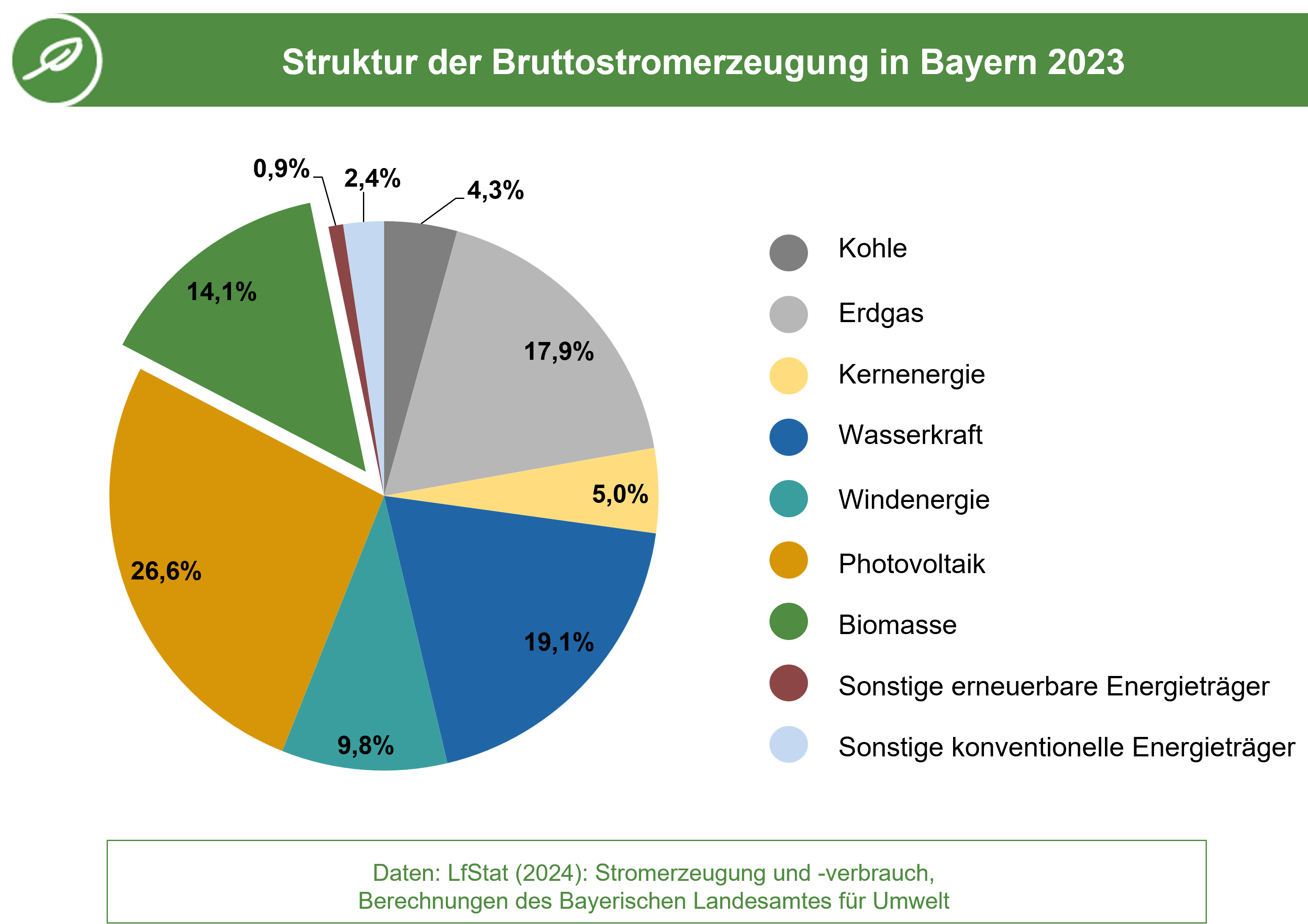 Im Jahr 2023 betrug der Anteil von Strom aus Biomasse 14,1 % an der Bruttostromerzeugung in Bayern.