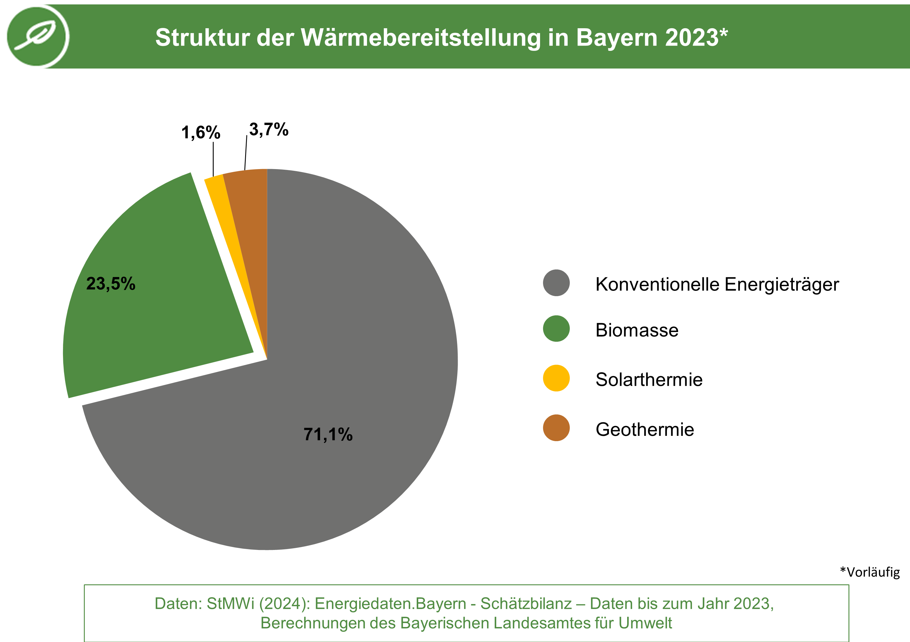 Im Jahr 2023 hatte die Biomasse – in Form von fester und flüssiger Biomasse, Bio- und Klärgas sowie biogenem Abfall – einen Anteil von 23,5 % an der benötigten Wärme in Bayern (Wärmebereitstellung - Vorläufige Werte).