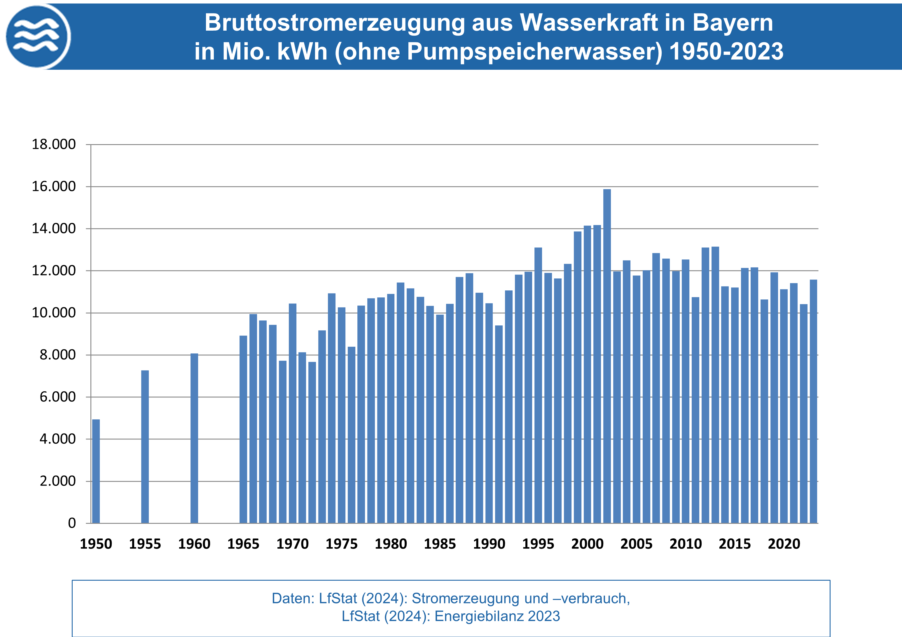 Im Jahr 2023 wurde in Bayern 11,6 Mrd. kWh Strom aus Wasserkraft erzeugt. Damit betrug der Anteil an der Bruttostromversorgung in Bayern 19,1 %, der Wasserkraftanteil an den erneuerbaren Energien bei der Stromerzeugung etwa ein Viertel.