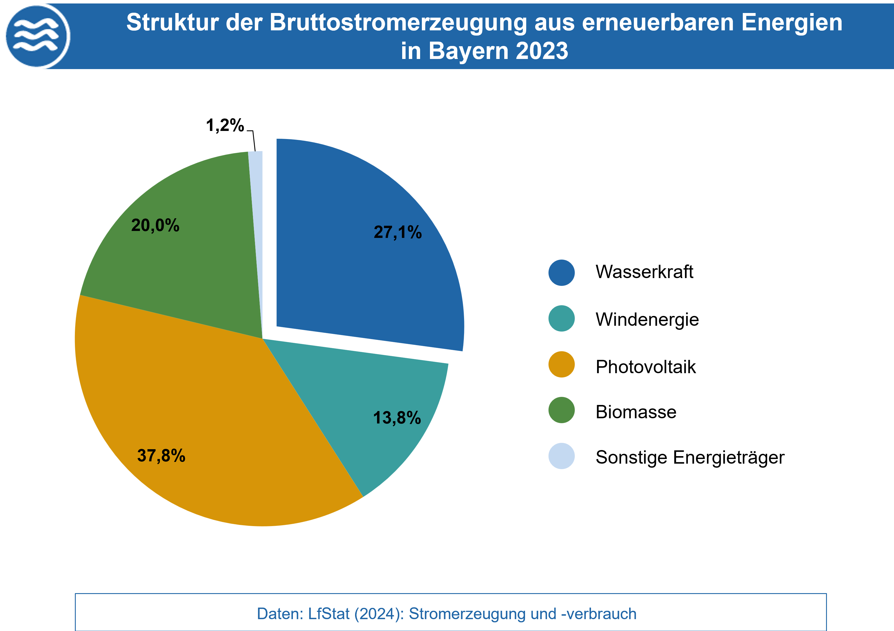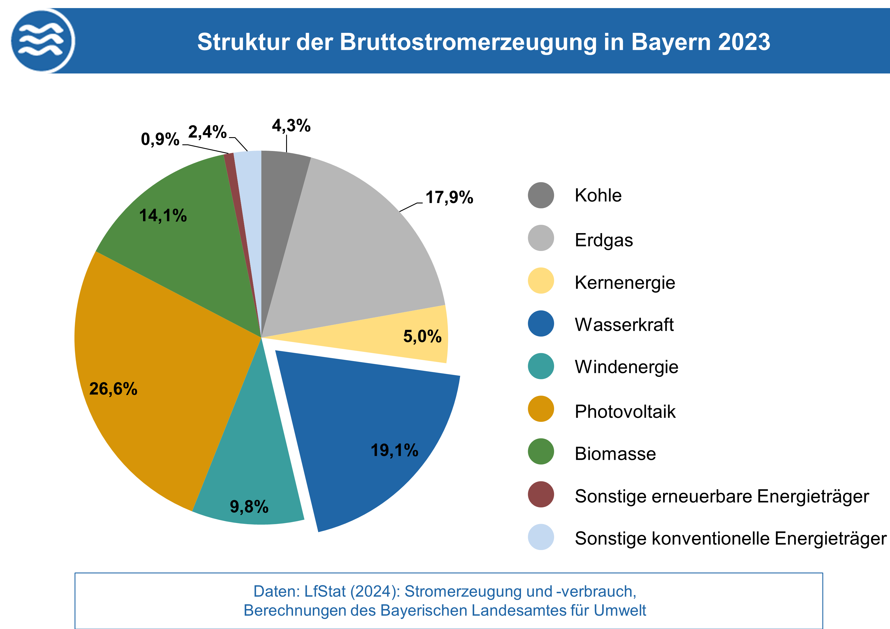 In den letzten Jahren stellte die Wasserkraft mit rd. 12,2 Mrd. kWh (langjähriger Mittelwert) einen Anteil zwischen 12 und 19 Prozent an der Bruttostromerzeugung in Bayern. Damit können rechnerisch rund 4 Millionen bayerische Haushalte mit Strom versorgt werden. Somit ist das Wasser der zweitbedeutendste erneuerbare Energieträger Bayerns. Bis auf abflussbedingte Schwankungen ist das Stromdargebot aus Wasserkraft relativ konstant, Wasserkraft stellt damit im Vergleich zu anderen erneuerbaren Energien einen hohen Anteil gesicherter Leistung zur Verfügung.