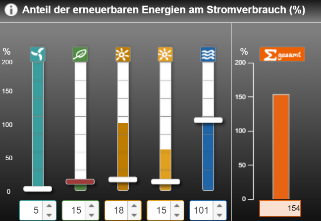 Mit unserem interaktiven Werkzeug "Mischpult" erhalten Sie auf einen Blick den aktuellen Stand der Nutzung erneuerbarer Energien für jeden Ort in Bayern. Eigene Energiemix-Szenarien können Sie mit Hilfe der Schieberegler ganz einfach einstellen. Die lokalen Potenziale erneuerbarer Energien zeigen Ihnen die örtlichen Ausbaumöglichkeiten an.