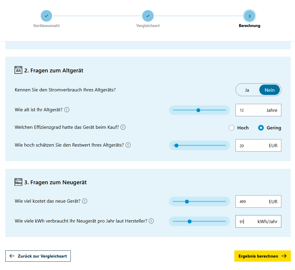 Der Haushaltsgerätecheck wurde grundlegend überarbeitet. Neben einem neuen Design und aktualisierten Rahmendaten gibt es ein besonderes Feature. Den Vergleich Altgerät gegen Neugerät können Sie nun auch nutzen, wenn Sie den Stromverbrauch Ihres Altgerätes nicht kennen. Geben Sie einfach das Alter Ihres alten Gerätes und die Effizienz zum Zeitpunkt des Kaufs ein und der Haushaltsgeräte-Check ermittelt einen Schätzwert für den Stromverbrauch. Probieren Sie es aus!