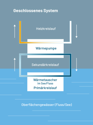 Die Wärmeübertragung eines geschlossenen Systems verläuft direkt im Gewässer mittels eines separaten Wärmetauschers. Dem Gewässer muss somit kein Wasser über eine Ausleitstrecke für den anschließenden Wärmeübertragungsprozess entnommen werden.